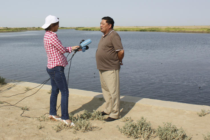 Nazhmadin Musabayev, the former governor of the Aral Region, gives an interview at the Kokaral dam regarding the current situation in the region.