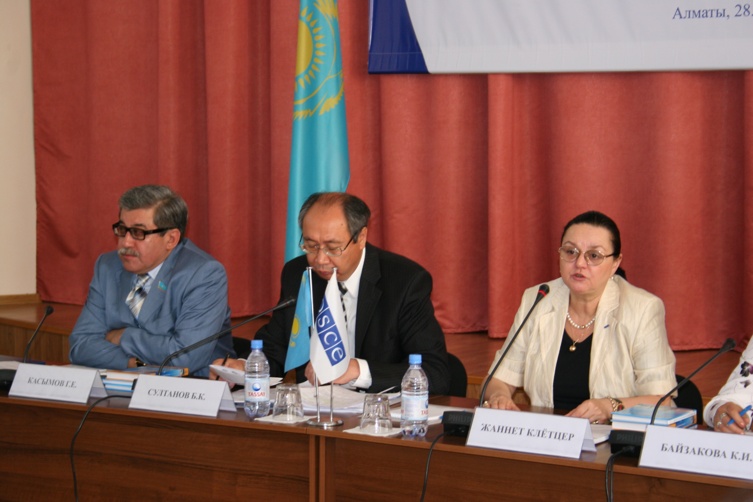 L-r: Gani Kassymov, Kazakh MP; Bolat Sultanov, Director of the Kazakhstan Institute for Strategic Studies and Jeannette Kloetzer, Deputy Head of the OSCE Centre in Astana at a conference on democratization and regional security, Almaty, 28 May 2009.