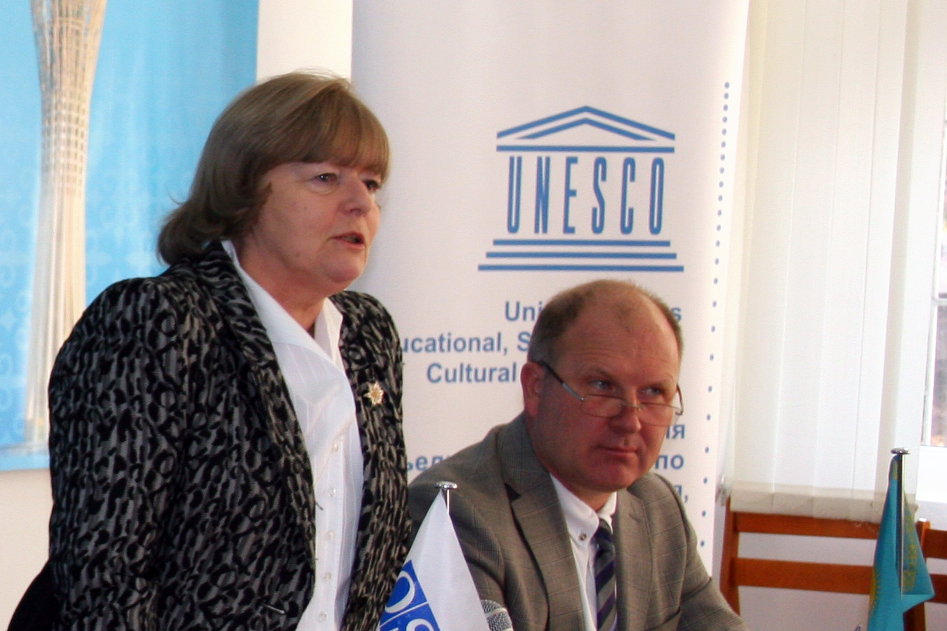 Ambassador Natalia Zarudna (l), Head of the OSCE Centre in Astana, speaking during a roundtable meeting on the current state of journalism education, Almaty, 31 October 2013.