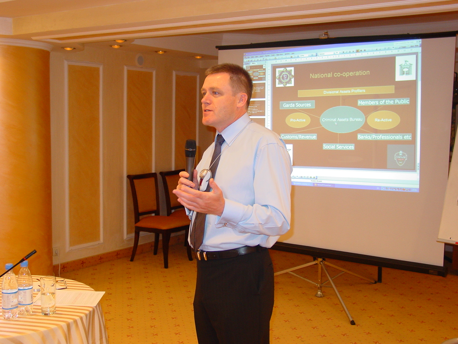 An expert from the Irish Garda Siochana (police) gives a presentation on seizing and recovering the proceeds of organized crime, Almaty, 14 July.