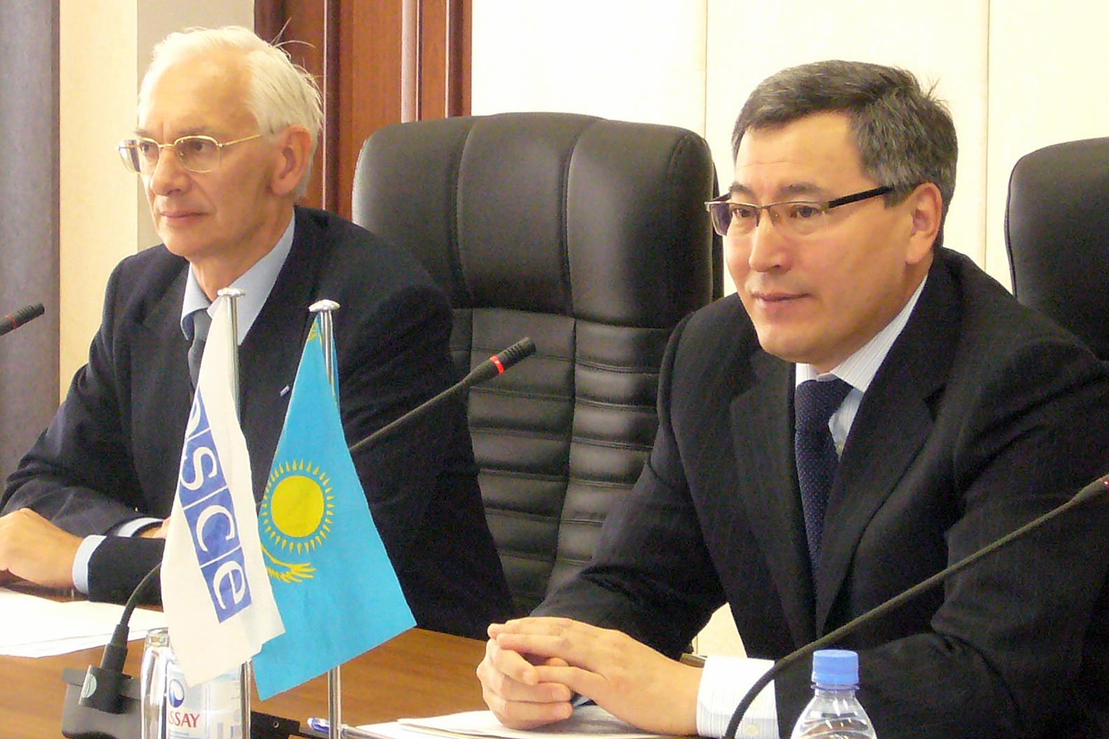 Amb. Alexandre Keltchewsky (l), Head of the OSCE Centre in Astana and Bolat Daukenov (r), Deputy Akim of Atyrau Oblast, at a news conference following the opening of an Aarhus Centre in Atyrau, Atyrau, 21 September 2009.