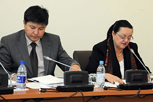 Kazakh MP Zhakip Assanov (l) and Deputy Head of the OSCE Centre in Astana Jeannette Kloetzer, addressing the participants of a roundtable on OSCE/ODIHR reviews of draft laws on crime prevention and domestic violence, Astana, 27 October 2009.