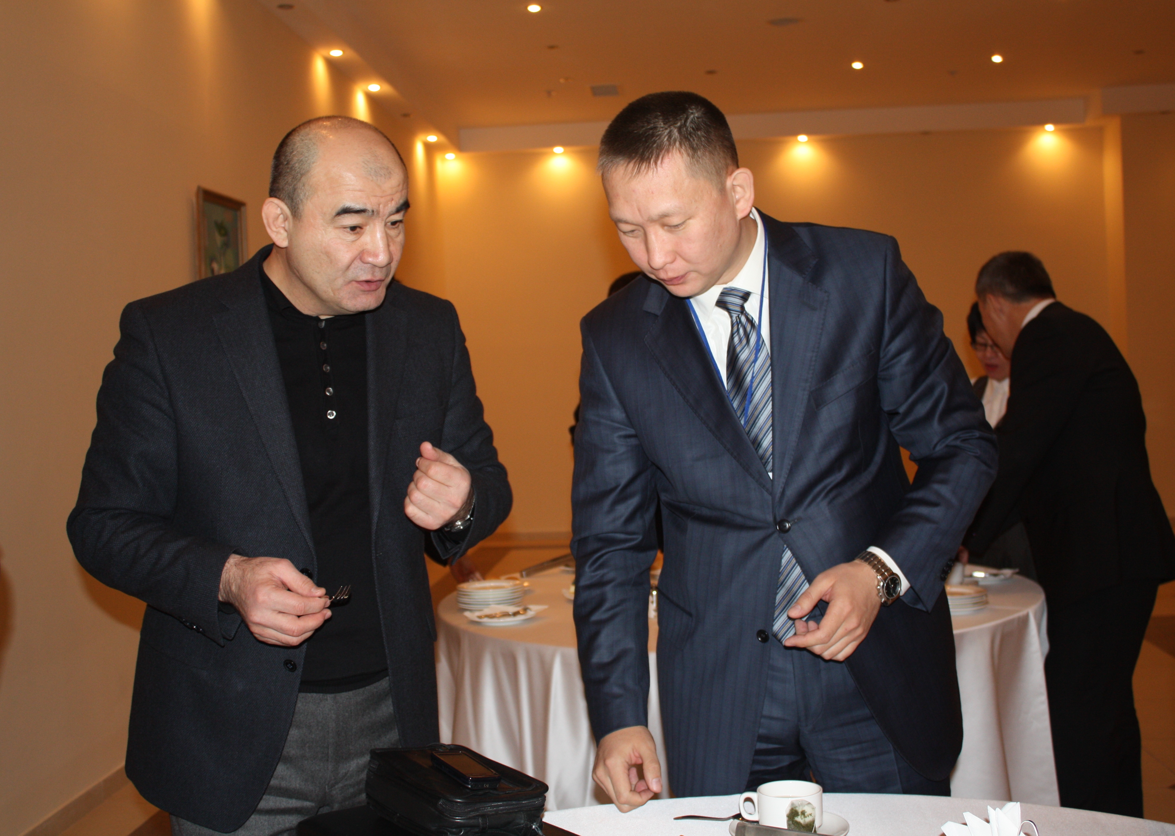 Marat Kogamov (l), Rector of Kazakh Humanities and Law University, discusses the possible impact of the law on simplification of pre-trial criminal procedures with barrister Daniyar Kanafin (r) at an OSCE-supported meeting in Astana, 22 December 2009.