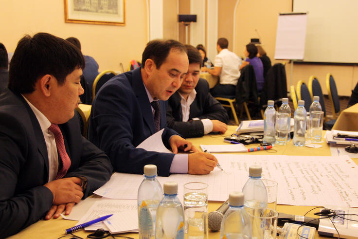 Baydaliyev Maksat, Head of the Information Analytical Centre of the Department on the Fight against Economic and Corruption Crimes of the Zhambyl region, Lieutenant Colonel of Financial Police, leads a group exercise during the three-day workshop on countering corruption, 25 July 2014.