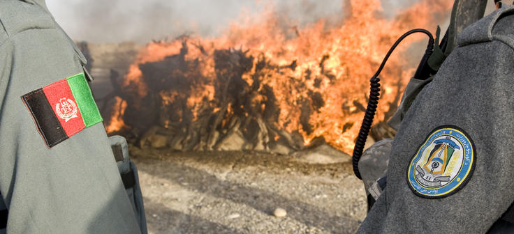 Afghan police officer and soldier stand guard as 18 tonnes of drugs burn at Lashkar Gah, 4 February 2009.