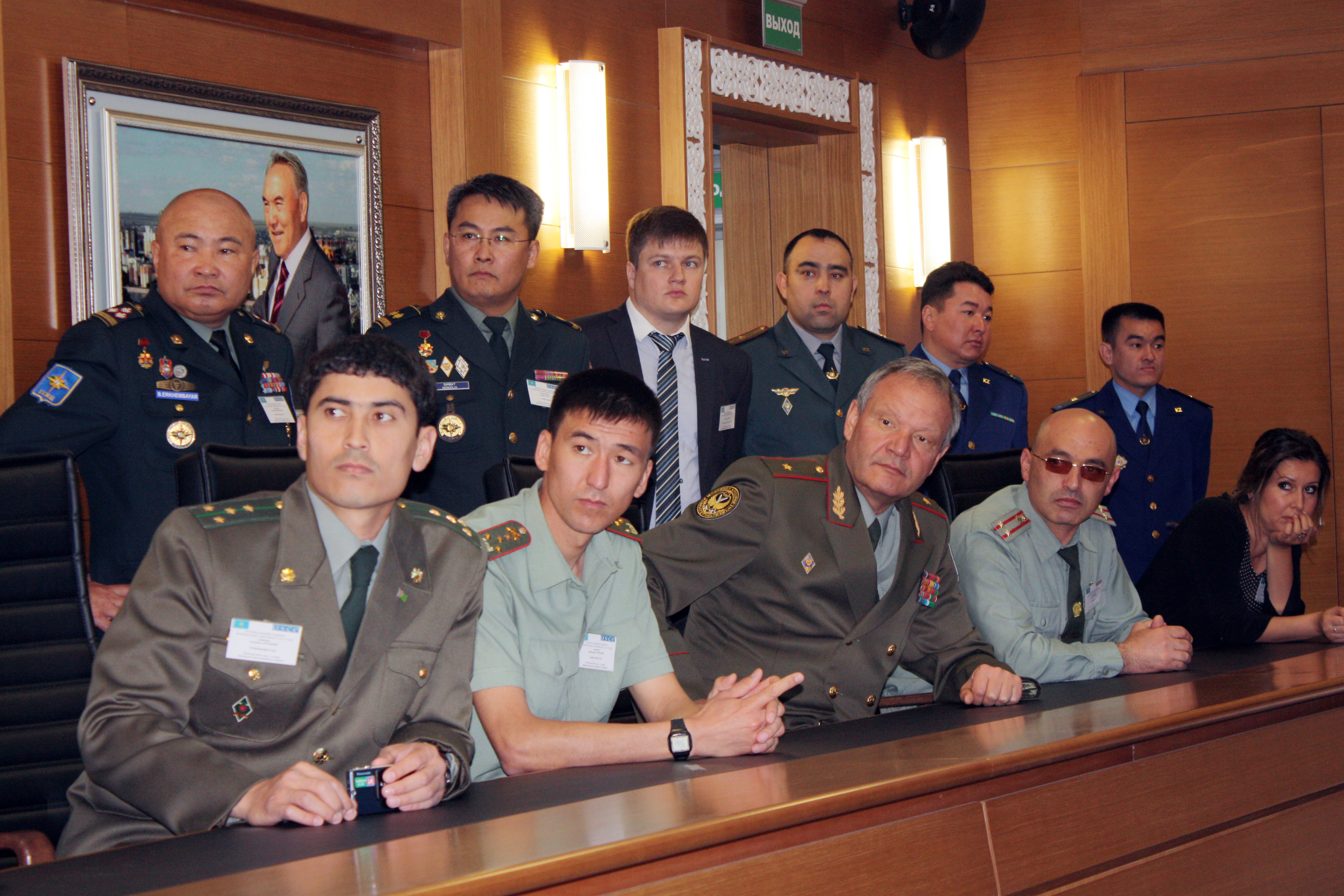 Military officers from 10 countries listen to the briefing of the Head of the National University of Defence, Astana, 26 May 2015.