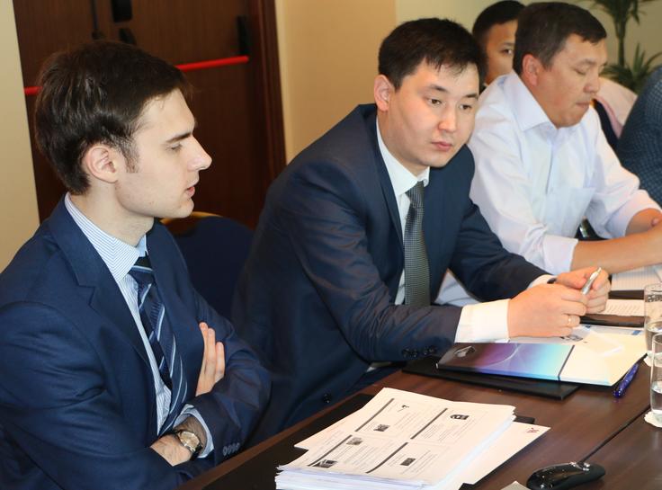 Paul Shoust, Executive Director of the Non-Commercial Partnership "Market promotion of electronic money" (l), explains the risks associated with the use of e-money, Astana, 22 July 2015.