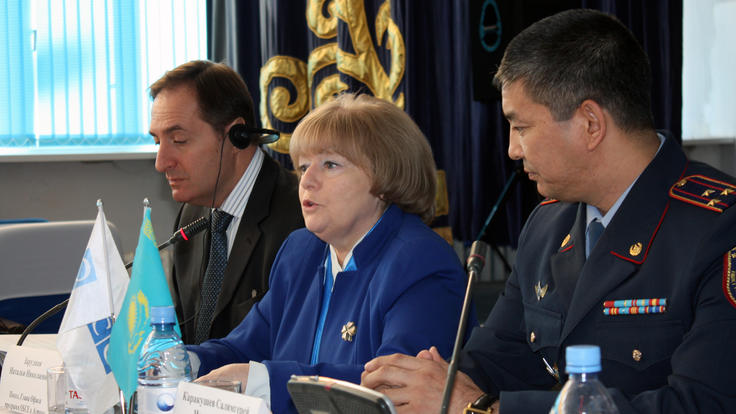 Ambassador Natalia Zarudna (c), Head of Mission at the OSCE Programme Office in Astana, speaks to police officers at the opening event of a training seminar on best practices and international standards in policing in multi-ethnic societies, Aktobe, Kazakhstan, 5 October 2015.