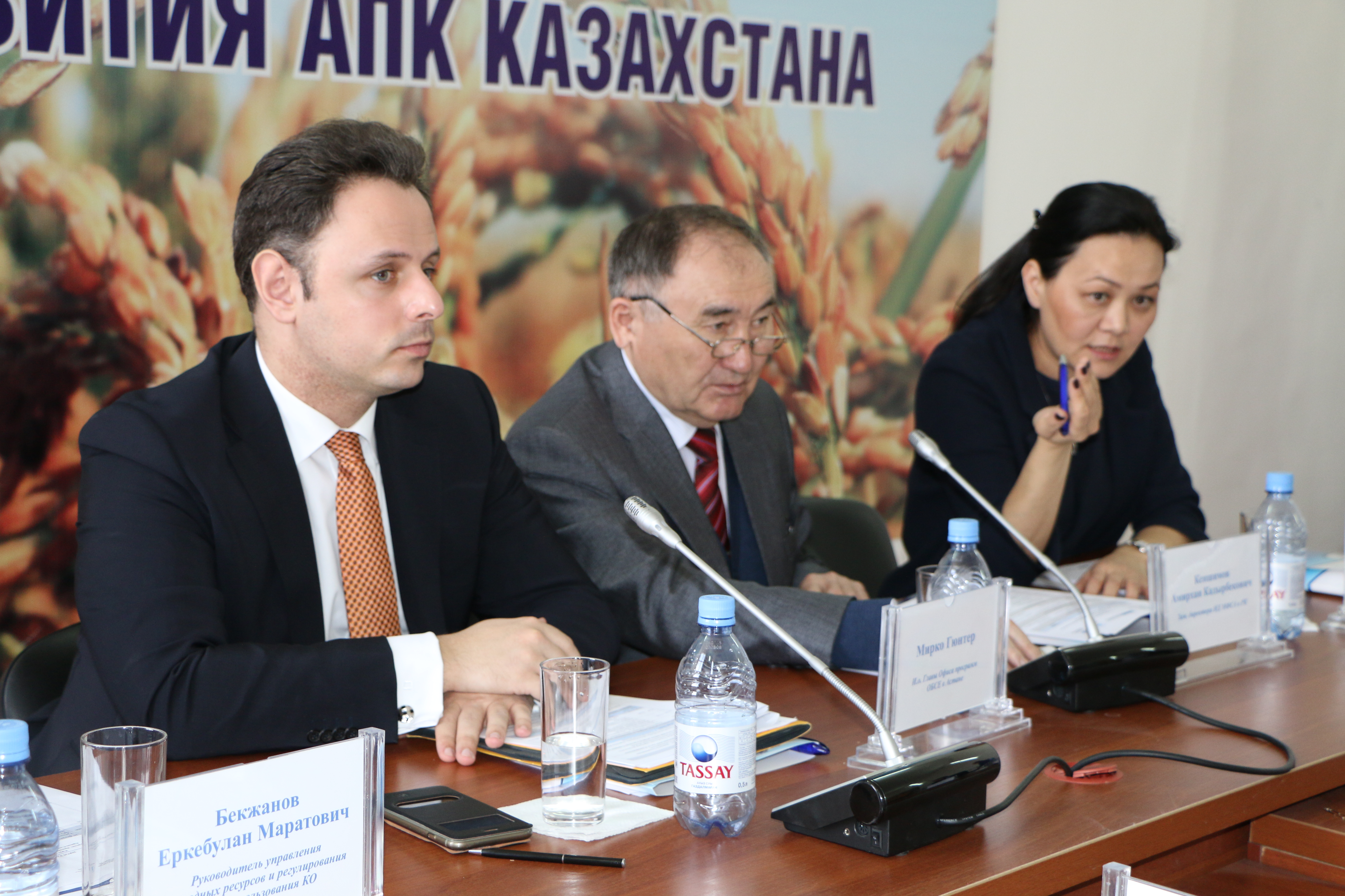 (L-r) Mirco Guenther, Acting Head of the OSCE Programme Office in Astana; Amirkhan Kenshimov, Deputy Head of the Executive Directorate of the International Fund for Saving the Aral Sea; and Danara Alimbayeva, Director of Environmental Monitoring Department of Kazhydromet during an opening of the workshop on water quality assurance of the Aral-Syrdarya Water Basin, Kyzylorda, 25 February 2016.