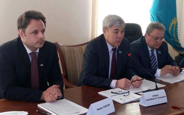 Kudaibergen Yerzhan, Member of the Mazhilis of the Parliament of Kazakhstan (centre) speaks on the importance of new laws on access to information and public councils with Mirco Guenther, Deputy Head of the OSCE Programme Office in Astana (left) and Mukhtar Yerman, Member of the Mazhilis of the Parliament of Kazakhstan (right), Shymkent, 28 April 2016.