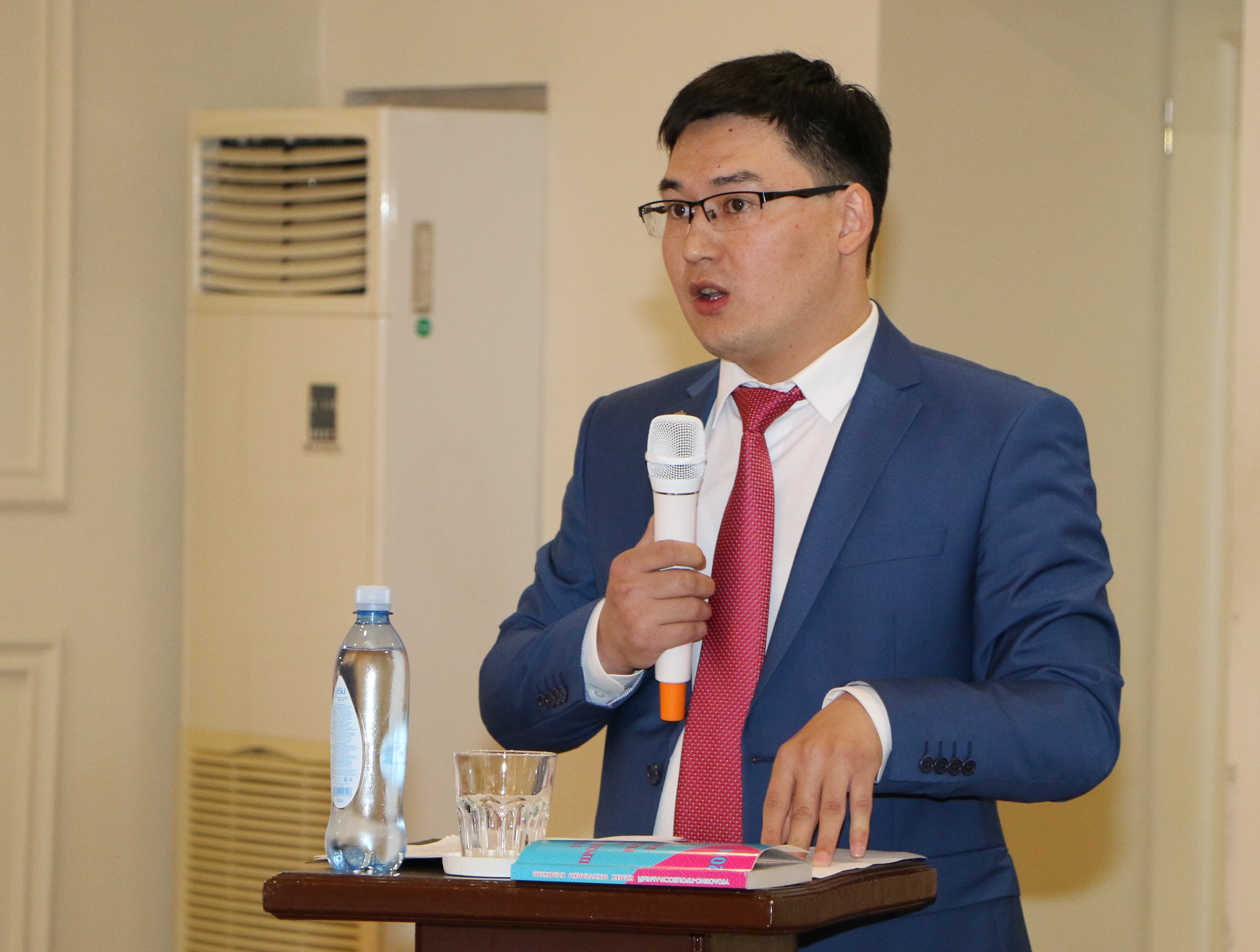 Chinghis Nurdaulet, Prosecutor of the Karaganda Region Prosecutor's Office, presenting current developments on investigation of human trafficking cases at a seminar for law enforcement, Karaganda, 29 April 2016.
