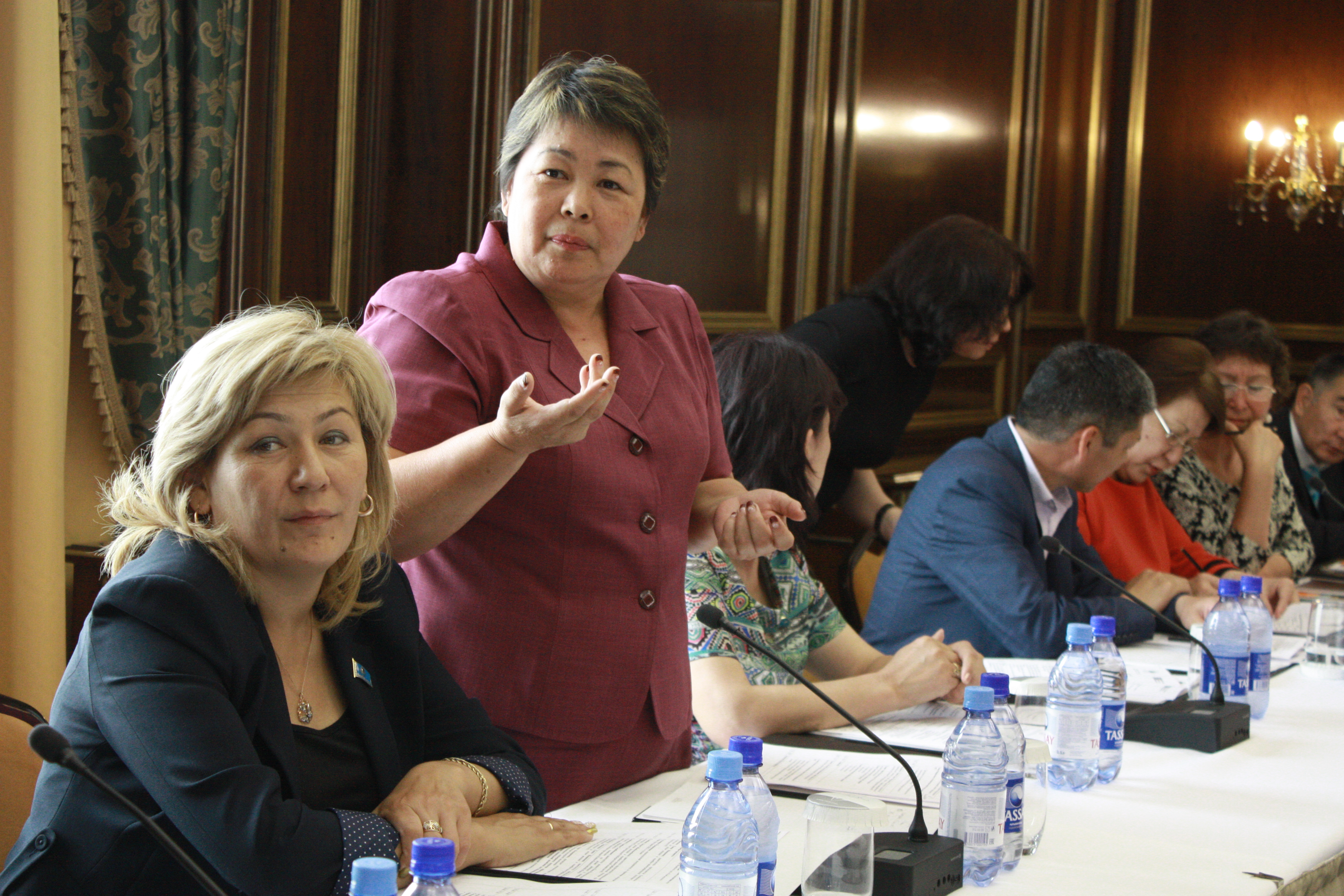 Rabiga Beisebayeva, Tolebi district local government's Deputy Head, actively involved in the discussion during the seminar on gender-mainstreaming principles in politics and local self-governance, Shymkent, 12 May 2016 (OSCE/Aigul Seralinova)