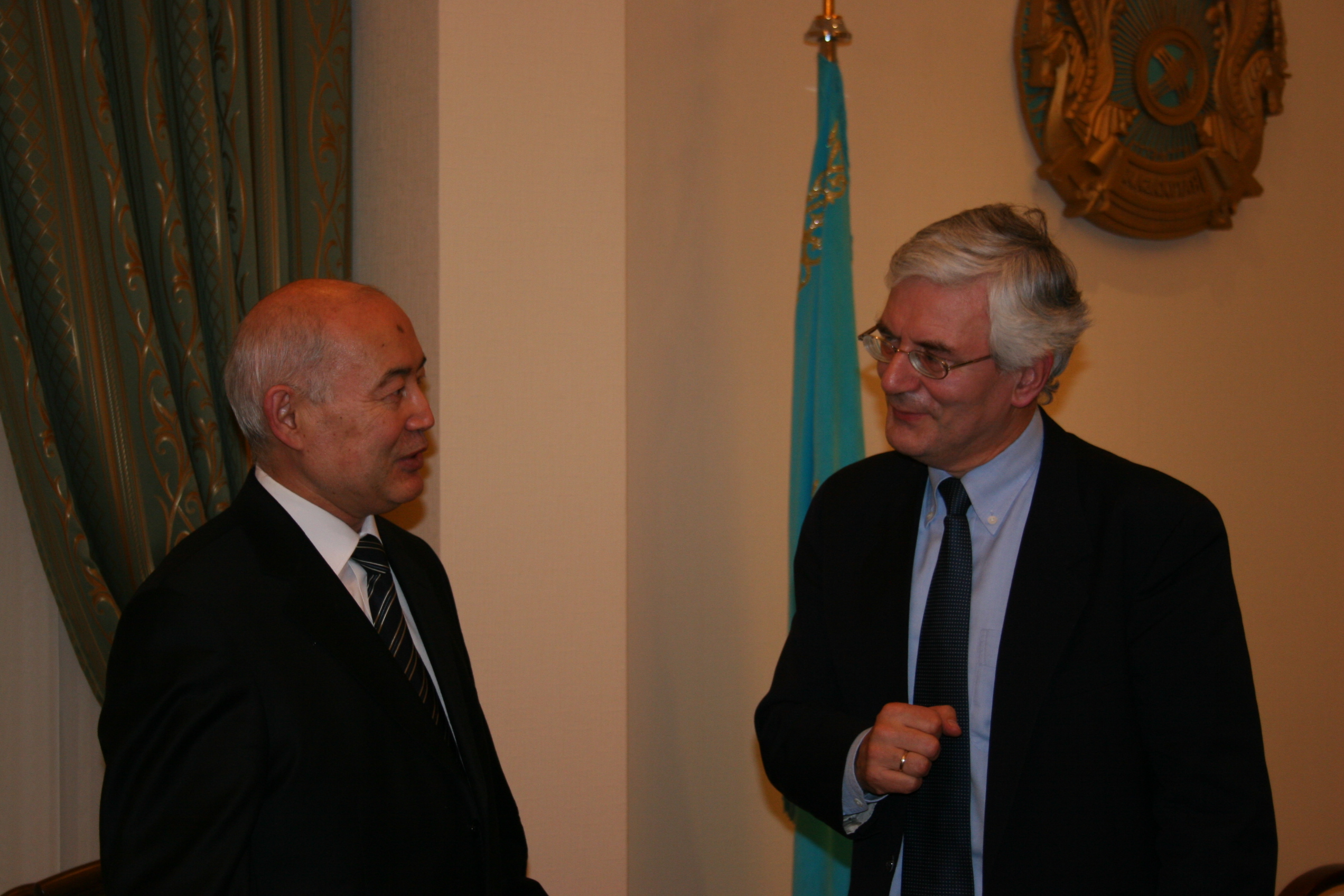 Head of the OSCE Centre in Almaty Ivar Vikki (right) meets the Chairman of Central Election Commission of Kazakhstan, Onalsyn Zhumabekov, Astana, 8 February 2006.