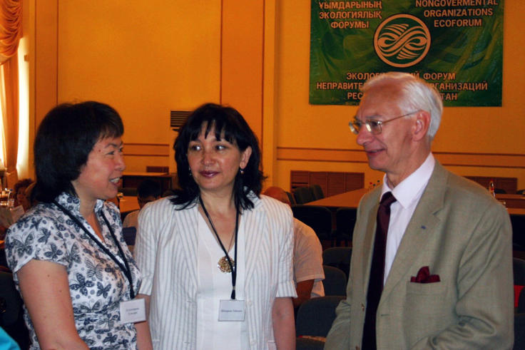 Head of the OSCE Centre in Astana Amb. Alexandre Keltchewsky (r), Tatiana Shakirova (c) (CAREC) and Gulsara Yeskendirova (Astana Aarhus Centre) discuss public involvement in the upcoming ministerial conferences on environmental protection, 12 June 2010.