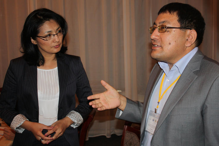 Aigul Turkina (l), Director of Zaman, an NGO, with Mirbulat Tnaliyev, Head of the Department for the Regional Inspection of Geology and Subsoil Use, at an OSCE-supported roundtable discussion on promoting transparency in Kazakhstan’s oil and gas industry, Uralsk, 29 June 2011.