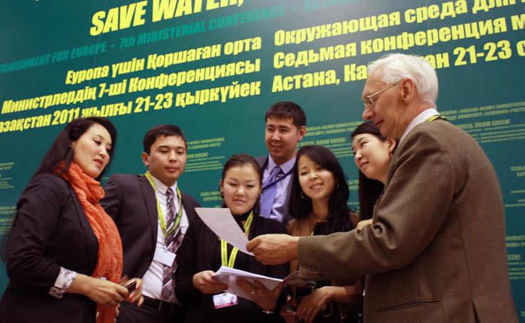 Ambassador Alexander Keltchewsky (r), the Head of the OSCE Centre in Astana, exchanges views on the Green Bridge Partnership Programme with representatives of Kazakhstan's Environmental Protection Ministry, Astana, 23 September 2011.