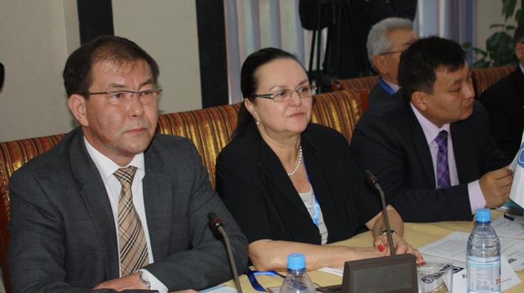 L-r: Demesin Nurmaganbetov, the Deputy Chairman of the IFAS Executive Committee, Jeannette Kloetzer, the Deputy Head of the OSCE Centre in Astana and Bakhyt Zhakhanov, the Deputy Akim of the Kyzylorda region, attend a conference on Aral Sea region environmental issues, Kyzylorda, 18 October 2011.