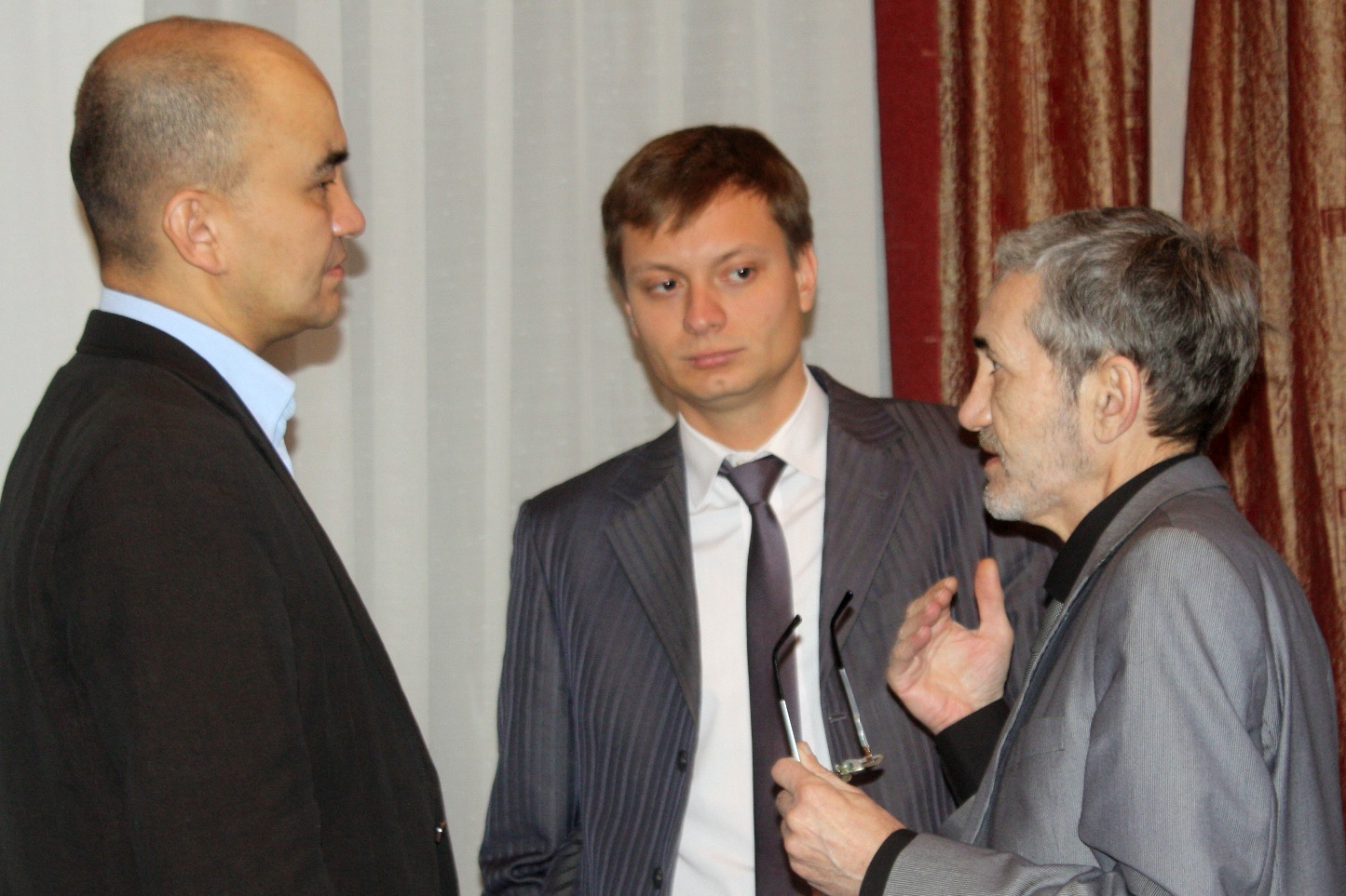 L-R: Maks Bokayev, Director of the NGO Arlan, Kiril Ossin, Director of NGO Eco Mangistau, and Yuriy Krivodanov, Director of NGO Blago, discuss their roles as moderators at a seminar in Uralsk, Kazakhstan, 2 December 2011.