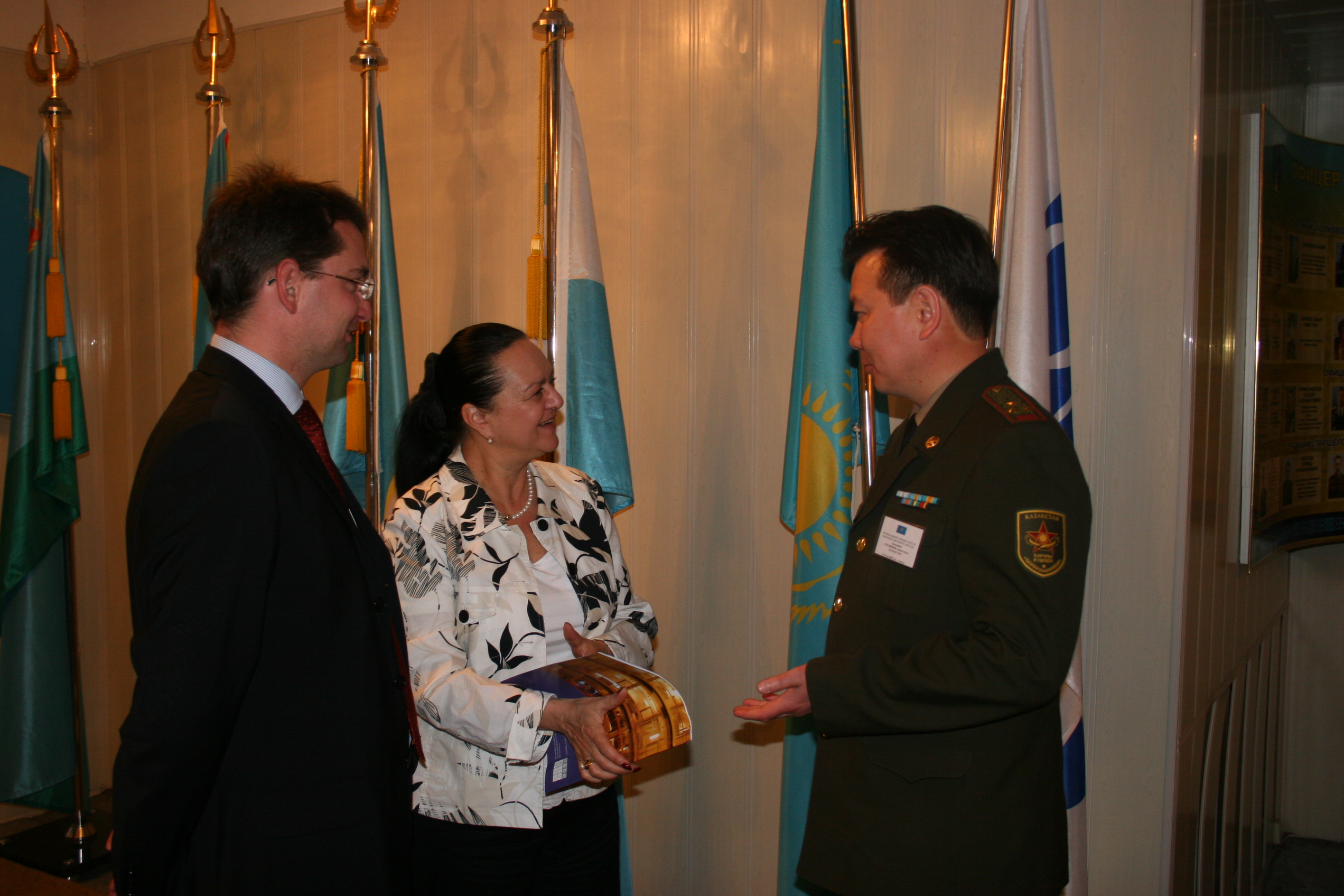 Deputy Head of the OSCE Centre in Astana, Jeannette Kloetzer (c), discusses ongoing projects with the Head of the Regional Arms Control Centre in Almaty, Amangeldy Aubakirov (r), and Forum for Security Co-operation expert Anton Martynyuk, 20 May 2008.
