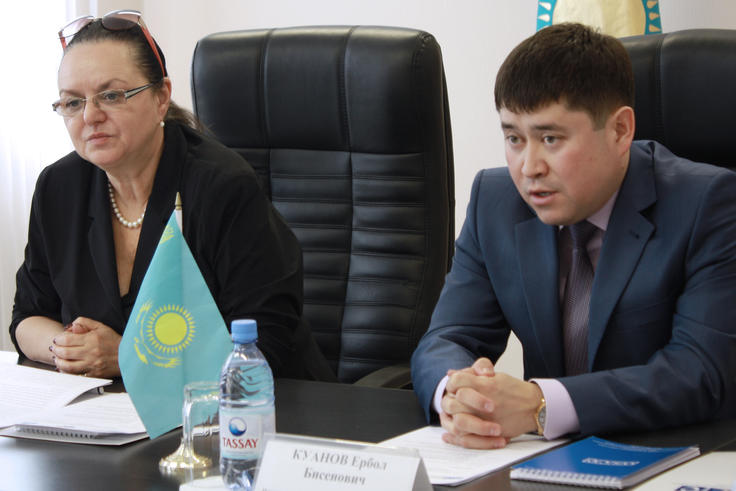 Deputy Head of the OSCE Centre in Astana, Jeannette Kloetzer (l), and Head of the Atyrau Region Natural Resources Management and Environmental Control Department, Yerbol Kuanov (r), participate at the OSCE-supported workshop, Atyrau, 4 April 2012.