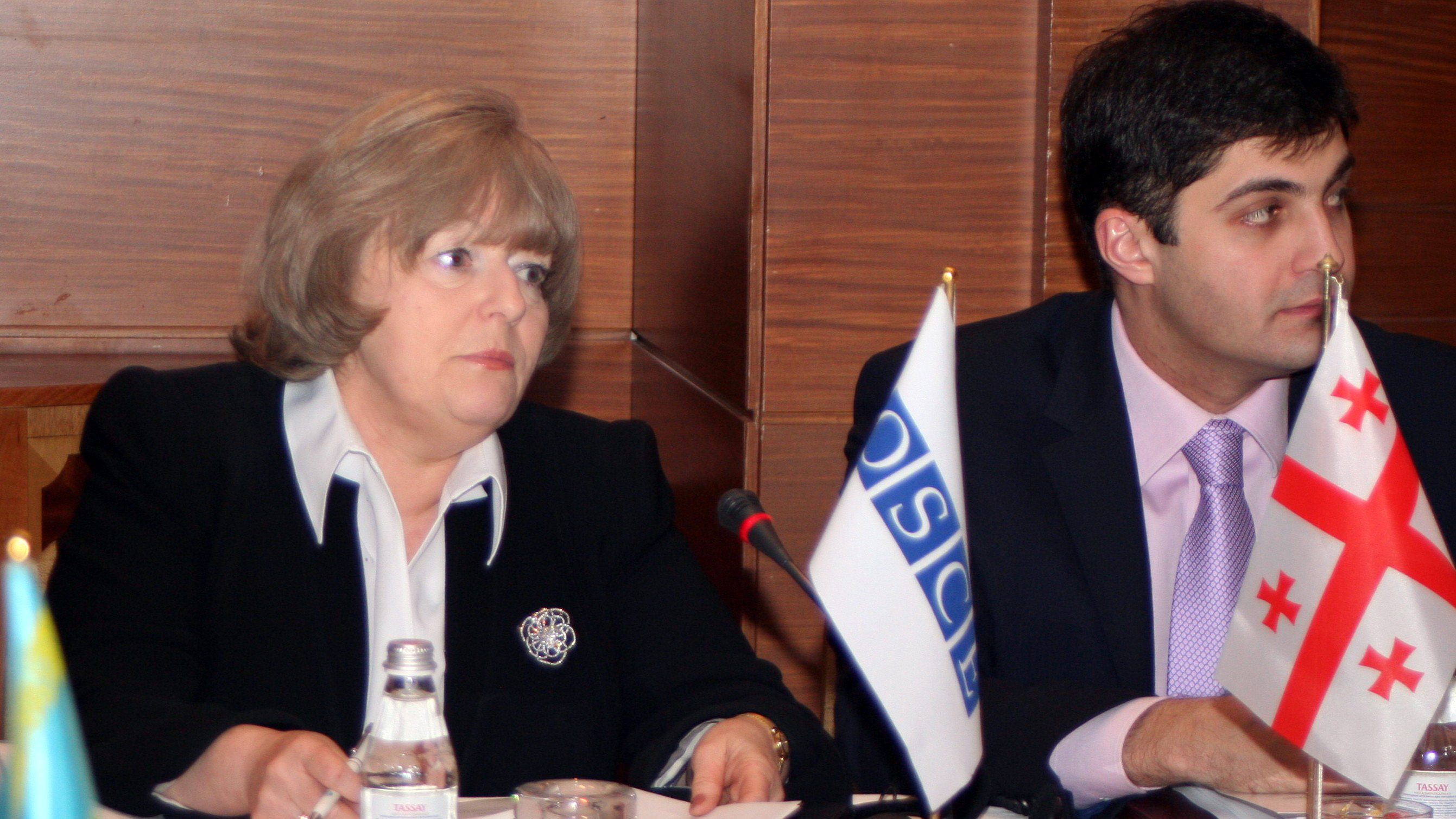Ambassador Natalia Zaruda (l), the Head of the OSCE Centre in Astana, alongside David Sakvarelidze, First Deputy Chief Prosecutor of Georgia, during a discussion on introducing plea bargaining into Kazakhstan’s criminal justice system, Almaty, 26 March 2012.