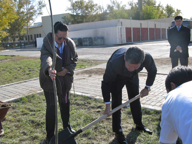 Kazakhstan's Minister of Environment Protection, Nurlan Iskakov (r) and the Deputy Head of the OSCE Centre in Astana, Jeannette Kloetzer (l) at a symbolic tree planting during a seminar on green investments, 2 October 2008.