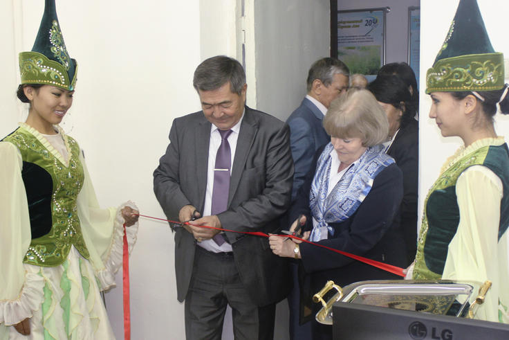 Ambassador Natalia Zarudna (r), Head of the OSCE Centre in Astana, and Kylyshbay Bisenov, President of Kyzylorda State University, take part in a ribbon-cutting ceremony to mark the opening of the OSCE-supported Kyzylorda Training Centre for Aral-Syrdarya Basin Water Management, Kyzylorda, 15 October 2012.