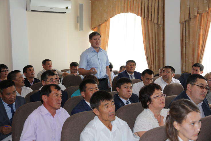 An Akim (Mayor) from a rural area asks a question about the financial aspects of local self-governance, during an OSCE-supported seminar, Aktobe, 1 August 2014.