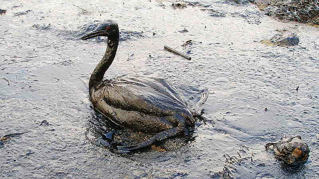 Қара теңізде мұнайдың жайылуы салдарынан зардап шеккен құстың суреті. ЕҚЫҰ-ның Астанадағы бағдарламалар офисі мұнайдың мұндай жайылу жағдайларына қатысты дайындықты реттеу және оларға халықаралық деңгейде жауап қайтару әрекеттерін ілгері жылжыту бойынша дөңгелек үстел ұйымдастырды.