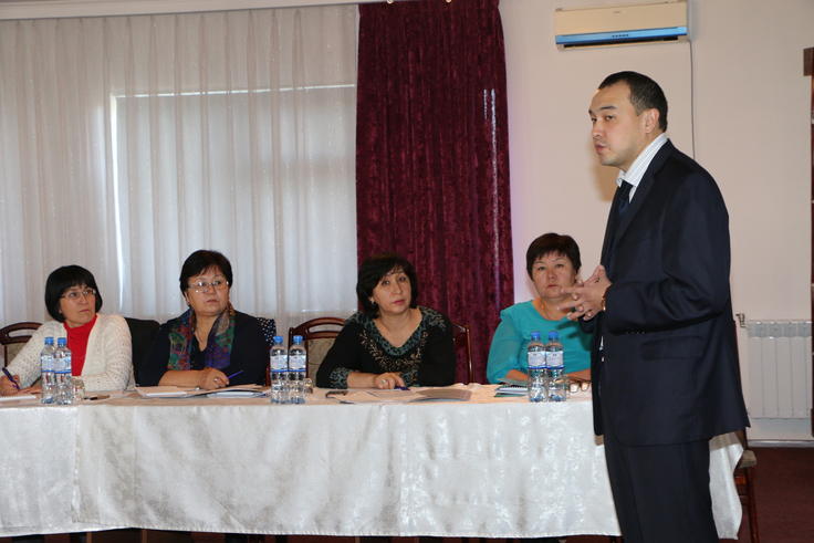 Zhangali Kenbayev (r), Head of the Centre for Training Specialists in Combating Illegal Migration and Trafficking of Karaganda Police Academy at the Ministry of Internal Affairs, trains social workers at the event Shymkent, 23 October 2015.