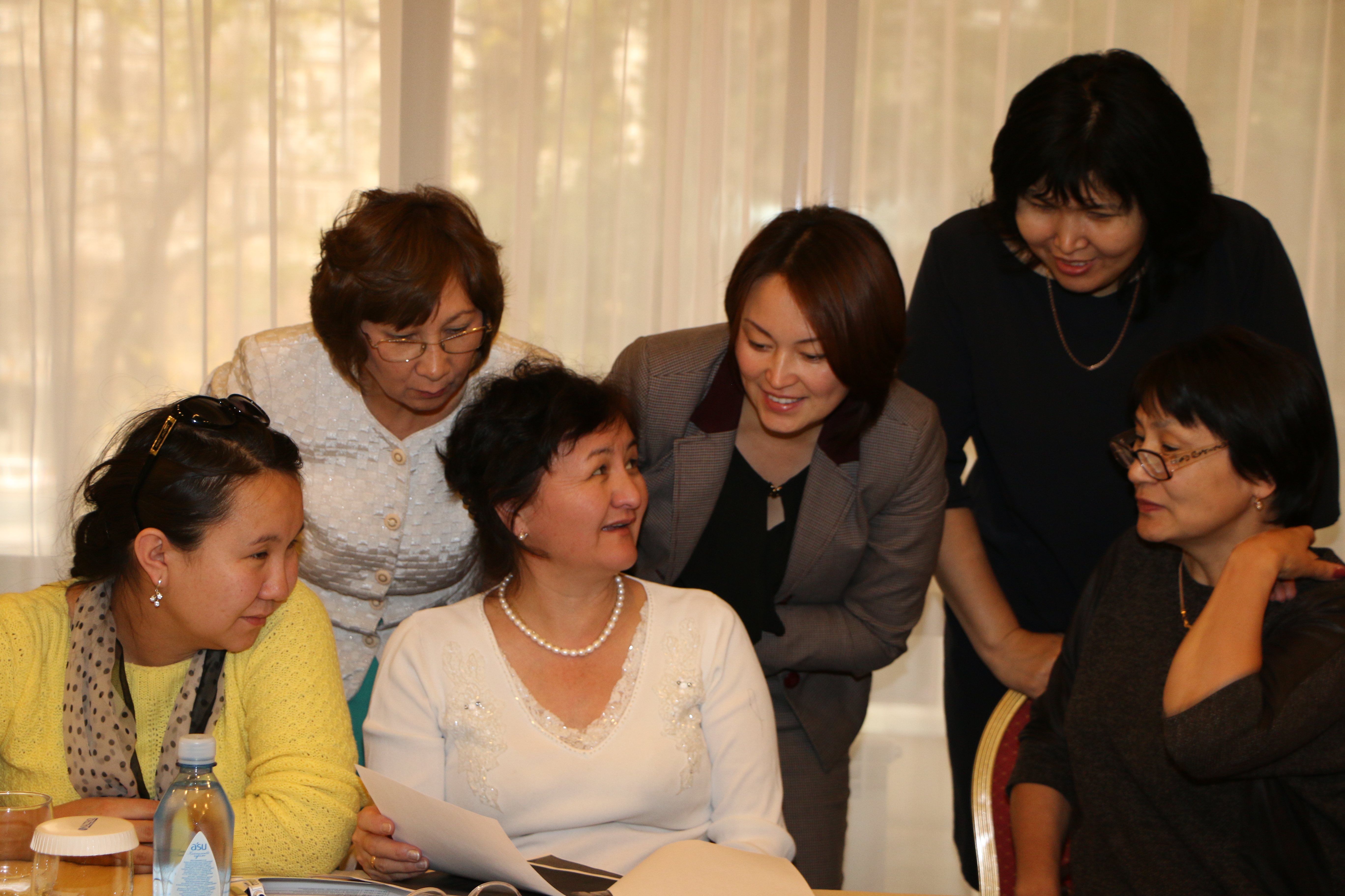 Әлеуметтік қызметкерлер адам саудасының құрбандарын анықтау жолдарын зерделеу жөніндегі топтық тапсырманы орындауда, Алматы, Қазақстан, 5 қараша 2015 жыл.