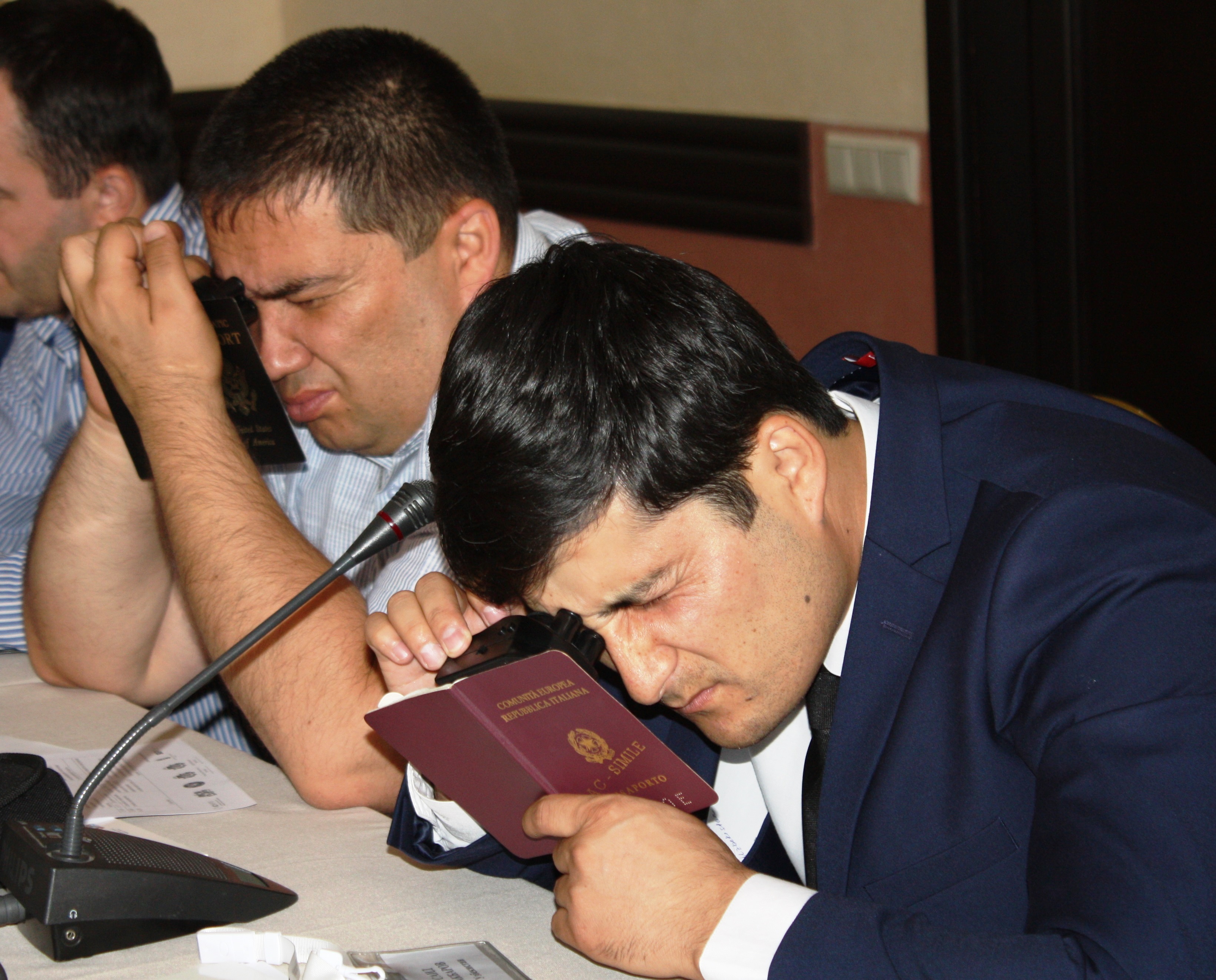 Two participants engage in a practical exercise to distinguish genuine and forged travel documents. Almaty, Kazakhstan, 22 June 2016.