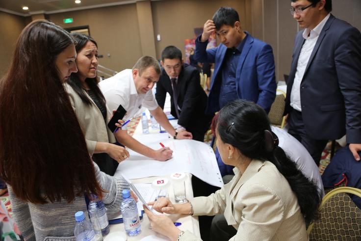 Адвокаттарға арналған Астанадағы оқыту семинарының қатысушылары топтық жаттығу кезінде, 22 шілде 2016 ж.,Астана қ.