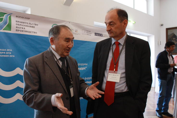 Елші Дьердь Сабо, Астанадағы ЕҚЫҰ Бағдарламалар офисінің Басшысы және Әмірхан Кеншімов, Қазақстандағы Халықаралық Аралды құтқару қорының (ХАҚҚ) Атқарушы дирекциясы Басшысының орынбасары елдегі су ресурстары саласындағы білім беру мәселелері бойынша қазіргі кездегі жағдайды талқылауда, Алматы, 28 қараша 2016