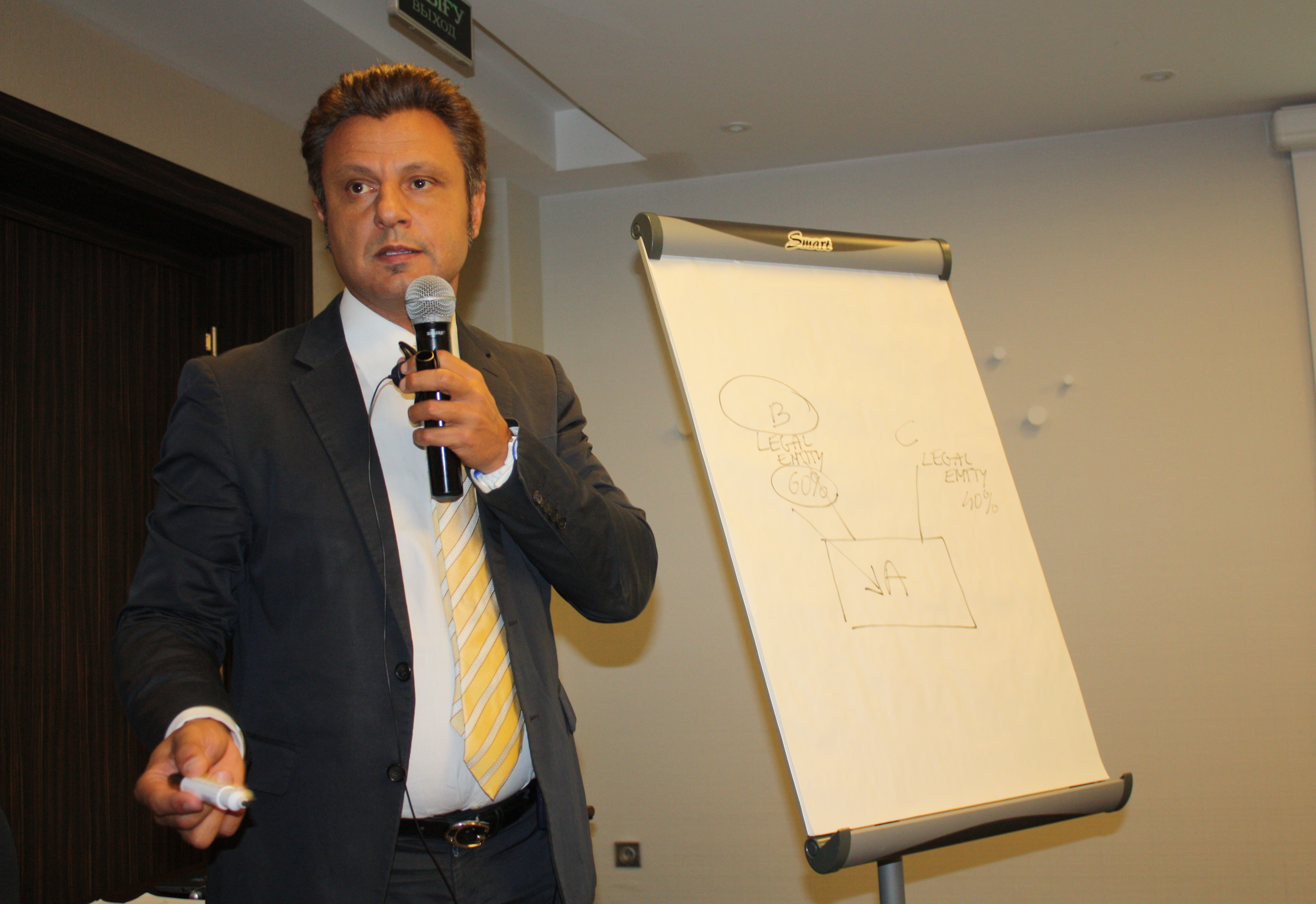 ЕҚЫҰ қолдауымен Италиядан келген сарапшы Джузеппе Ломбардо заңды тұлғалардың бенефициарлық меншік иелерін кезең-кезеңмен айқындау әдістерімен бөлісуде, Астана, 21 қыркүйек 2017 ж.