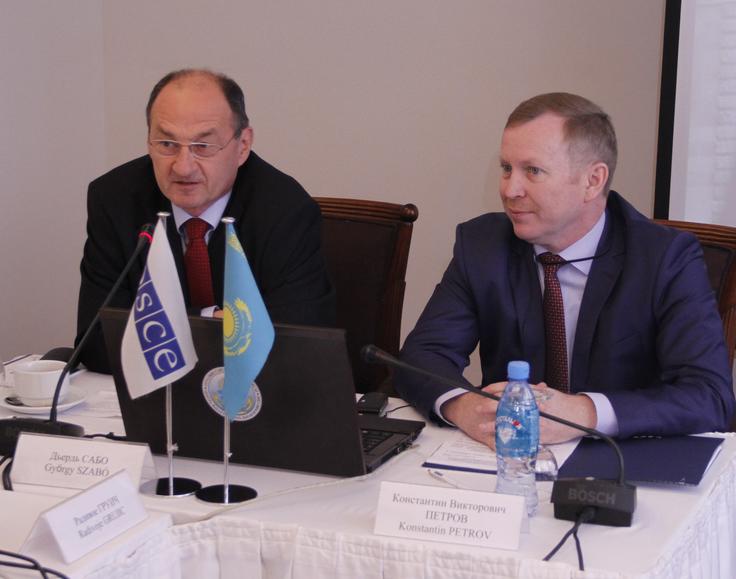 Елші Дьердь Сабо, Астанадағы ЕҚЫҰ Бағдарламалар офисінің басшысы (сол жақта) және Орталық сайлау комиссиясы Төрағасының орынбасары Константин Петров (оң жақта) сайлаушыларды тіркеу мәселелері жөнінде өткізілген семинарда, Астана, 16 қараша 2017 ж. (ҚР ОСК/Артем Федоров)