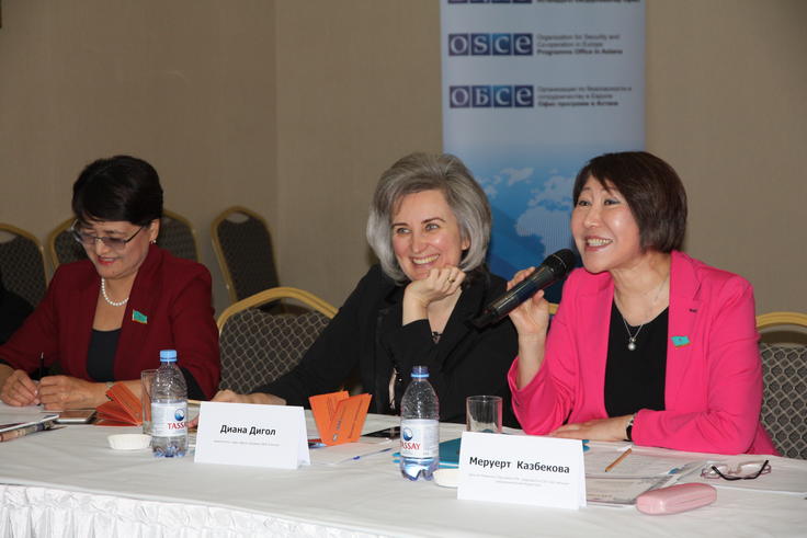 Майра Айсина, Парламент Мәжіліснің депутаты (сол жақта), Астанадағы ЕҚЫҰ бағдарламалар офисі басшысының орынбасары Диана Дигол (ортада) және Парламент Мәжілісінің депутаты, Қазақстанның кәсіпкер әйелдер одағының төрайымы Меруерт Қазбекова (оң жақта) ЕҚЫҰ қолдауымен өткен әйелдердің экономикалық мүмкіндіктерін және саясатқа қатысуын алға тарту мәселелеріне арналған дөңгелек үстелде, Астана қ., 28 қараша 2017 ж.