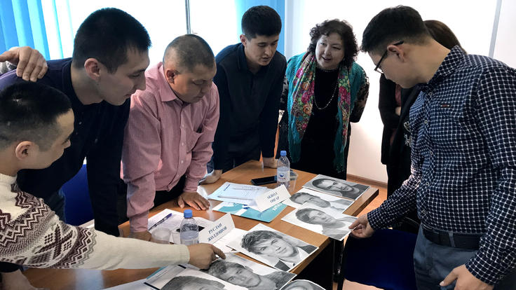 Оқыту семинарының қатысушылары ауызша сипаттама бойынша ықтимал қылмыскердің суретін анықтауға тырысуда, Қарасу шекаралық өткізу пункті, 28 наурыз 2018 ж.