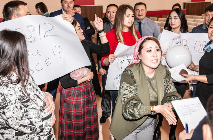 Оқыту курсының қатысушылар өзінің дағдыларын массалық жиын симуляциясында және одан кейнгі келіссөз процесінде қолдануда, Қарағанды, 17 сәуір 2019 ж.
