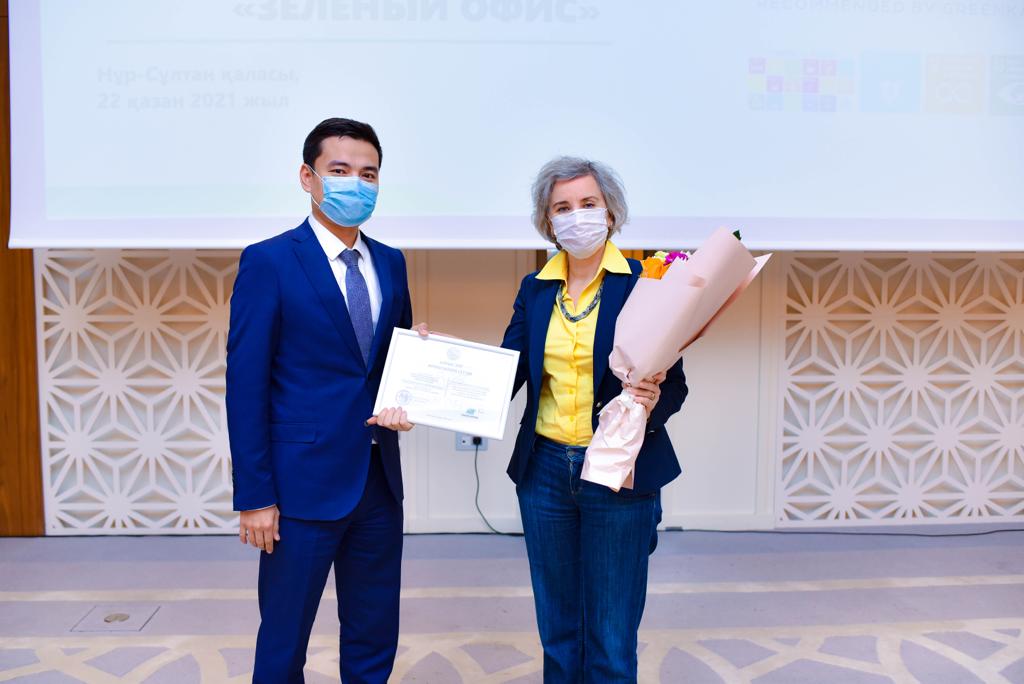 Д-р Диана Дигол, Нұр-Сұлтандағы ЕҚЫҰ Бағдарламалар офисі Басшысының орынбасары мен Экология, геология және табиғат ресурстары министрлігінің Экологиялық саясат және тұрақты даму департаментінің директоры Ағзан Ширанов жасыл кеңсе конкурсының марапаттау рәсімі кезінде, Нұр-Сұлтан, 22 қазан 2021 ж.