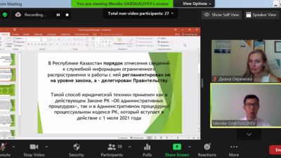 Нұр-Сұлтандағы ЕҚЫҰ Бағдарламалар офисі мен «Құқықтық медиа-орталығы» ҮЕҰ бірлесіп мемлекеттік органдардан, ғылыми ортадан, азаматтық қоғамнан және бұқаралық ақпарат құралдарымен байланысты мемлекеттік емес ұйымдарынан келген 35-ке жуық қатысушыға ақпаратқа қол жеткізуге арналған онлайн дискуссияны ұйымдастырды. Құқықтық медиа-орталығы қатысушыларға ақпаратқа қол жетімділік туралы ұлттық заңнамаға шолу жасап, әртүрлі санаттағы ақпаратты жіктеу, ақпаратқа қол жеткізу құқығын қорғау және ашықтық, есеп беру мәселелері бойынша ақпарат берді. Ұлттық сарапшы қызметтік бабында пайдалануға арналған ақпаратты (қызметтік пайдалануға арналған құжаттарды) реттейтін құқықтық актілерге құқықтық талдау жасады. Қатысушылар сондай-ақ бюджет шығыстары туралы ақпараттың қол жетімділігі, әртүрлі мемлекеттік органдардың ресми ақпаратқа қол жетімділігін реттейтін рәсімдер және азаматтық қоғамның ақпаратқа қол жетімділігін реттейтін заңнамалық процеске қатысуы мәселелерін талқылады.