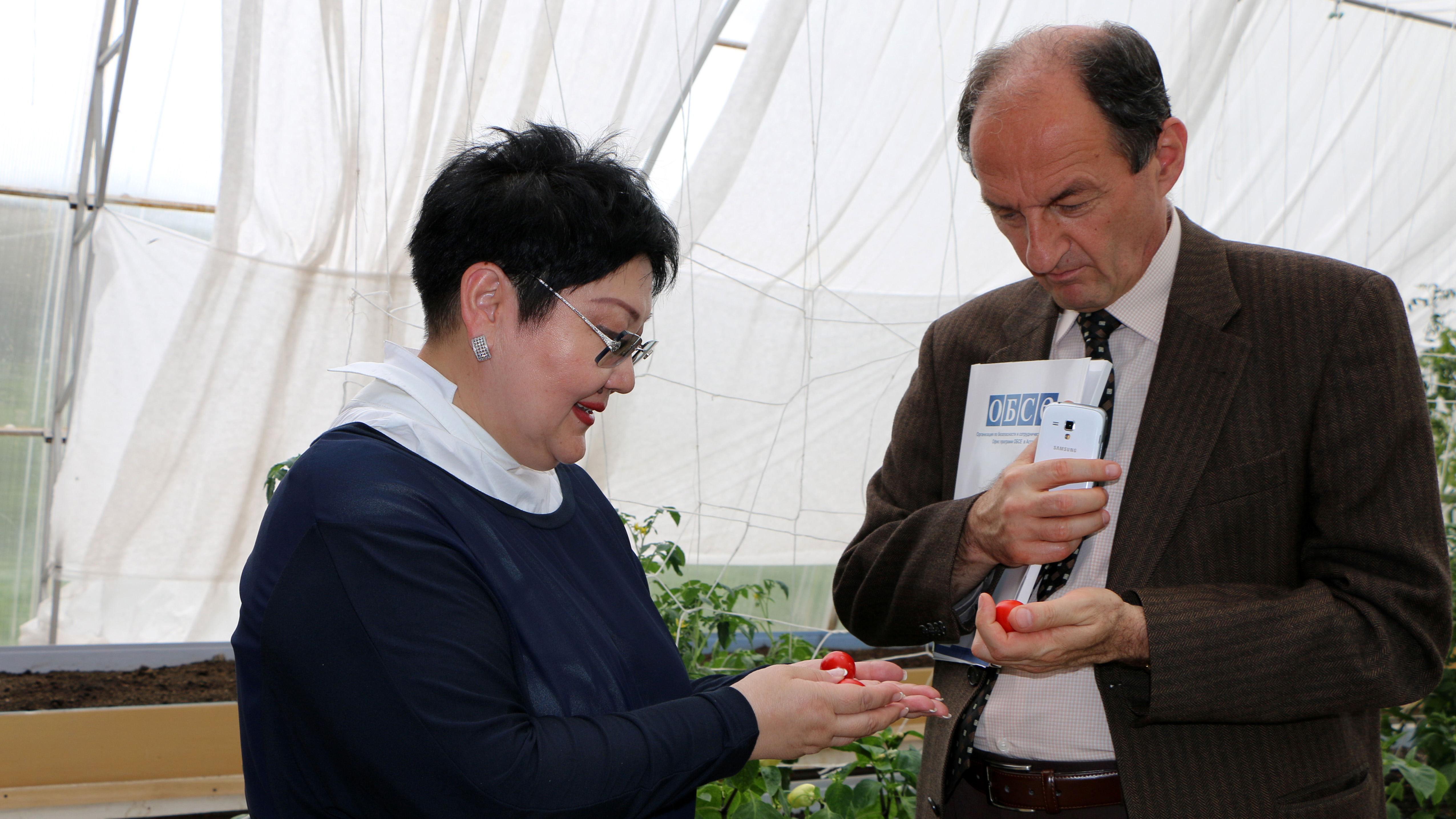 Ambassador György Szabó (r), Head of OSCE Programme Office in Astana, and Saltanat Rakhimbekova, Chairman of the Board of the "Coalition for a "Green Economy” and G-Global Development”, in a greenhouse in Arnasai, 29 July 2016.