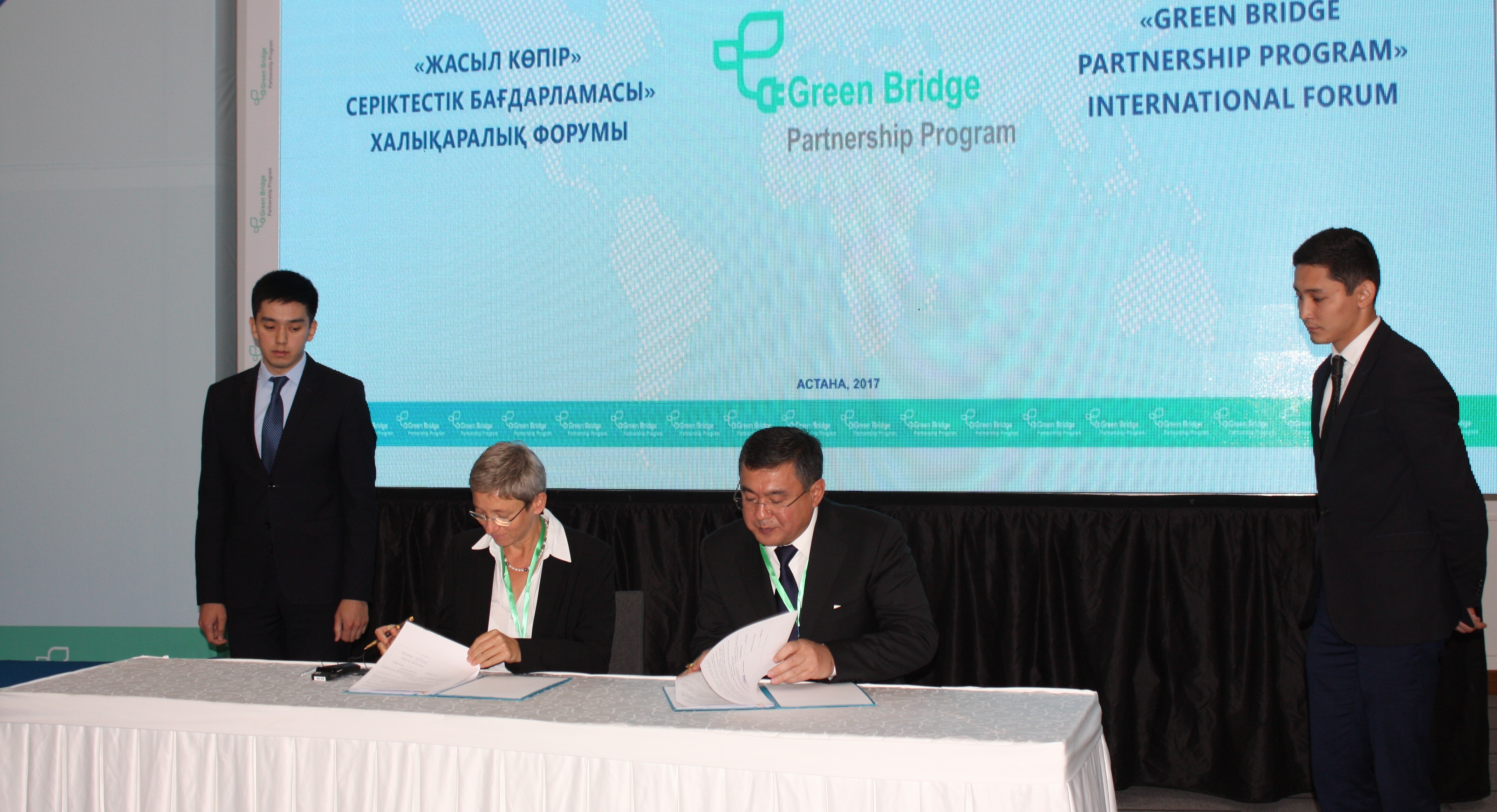 OSCE-facilitated singing ceremony of the Memorandum of Understanding between Brigitte Bach, Head of the Austrian Institute of Technologies and Gani Sadibekov, Vice-Minister of Energy of Kazakhstan, Astana, 12 July 2017.