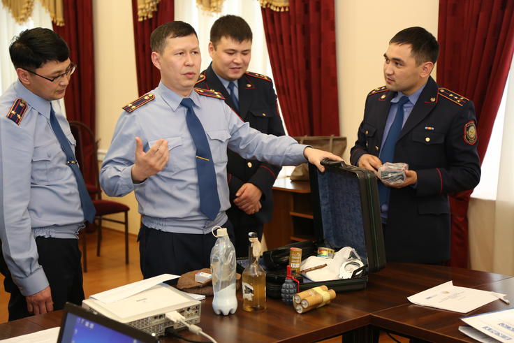 Police officers during a practical exercise are describing the contents of a passenger's suitcase, which might indicate criminal intentions of the person, Karaganda, 2 November 2017.