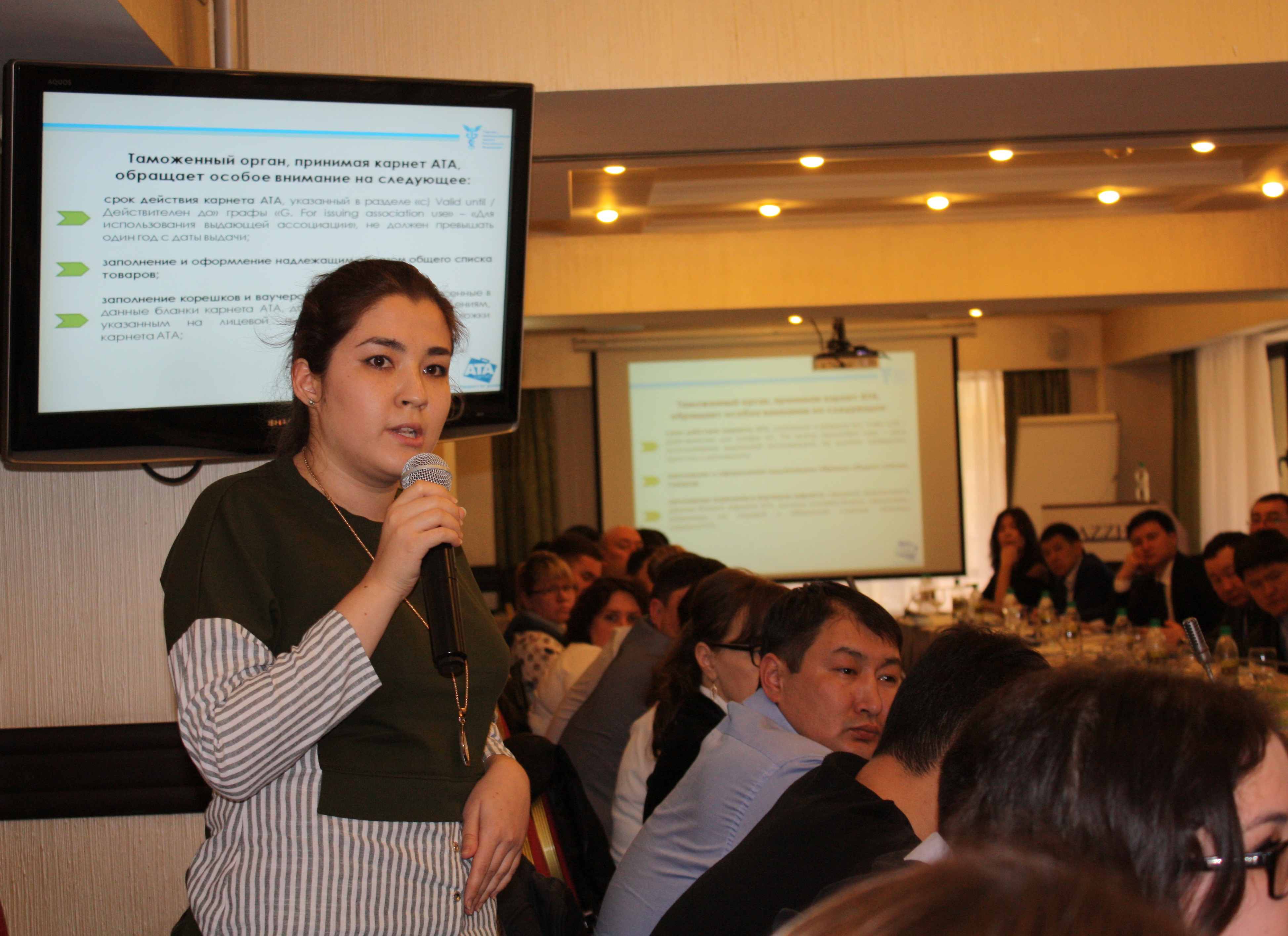 Representative of business community actively involved in the discussion during the workshop on temporary admission of goods, Almaty, 5 April 2018.