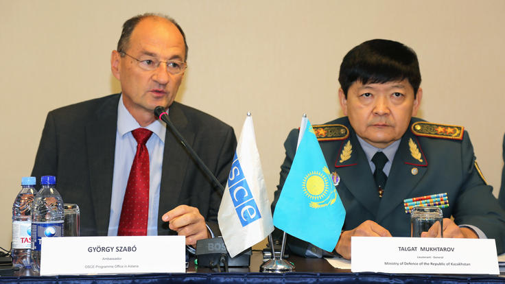 Ambassador György Szabó (l), Head of the OSCE Programme Office in Astana, speaks at the opening of the regional workshop on explosive hazards, Astana, 11 September 2018.