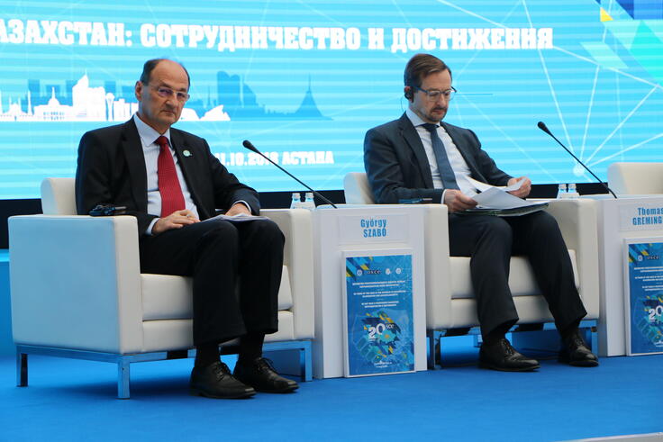 OSCE Secretary General Thomas Greminger (right) and György Szabó, Head of the OSCE Programme Office in Astana, (left) at the opening session of the Conference on the 20th Anniversary of the OSCE Presence in Kazakhstan, Astana, 11 October 2018.
