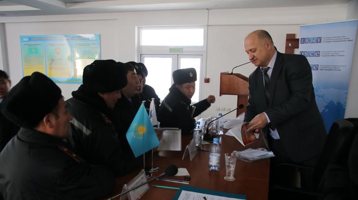 Community police officers are engaged in a discussion on the prevention of domestic violence with Sergey Korneichuk, Senior Lecturer at the Kostanai Academy of the MIA of Republic of Kazakhstan after Shyrakbek Kabylbayev, Esik, Almaty region, 19 February 2019.