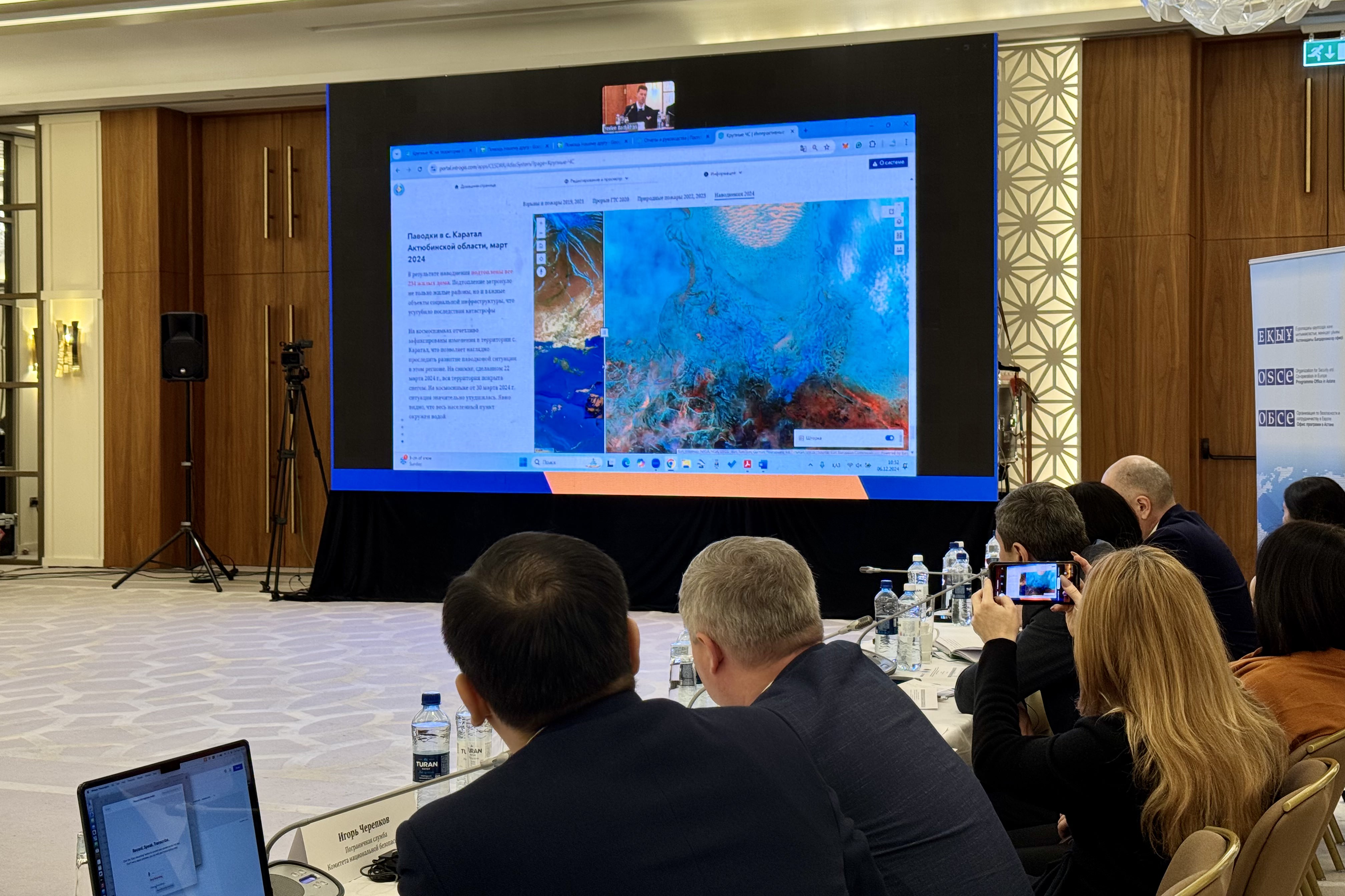 The speaker is showcasing the capabilities of the interactive maps, specifically their ability to monitor flood risks across Kazakhstan's territories, Astana, 6 December 2024.