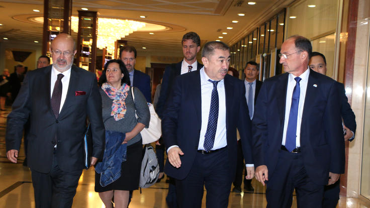 Erlan Turghymbaev, Minister of Internal Affairs of Kazakhstan (centre) together with the High Commissioner on National Minorities, Lamberto Zannier (l), and the Head of the OSCE Programme Office in Nur-Sultan, Ambassador Gyorgy Szabo (r), on their way to a workshop on community policing in multi-ethnic societies, Nur-Sultan, 3 September 2019.